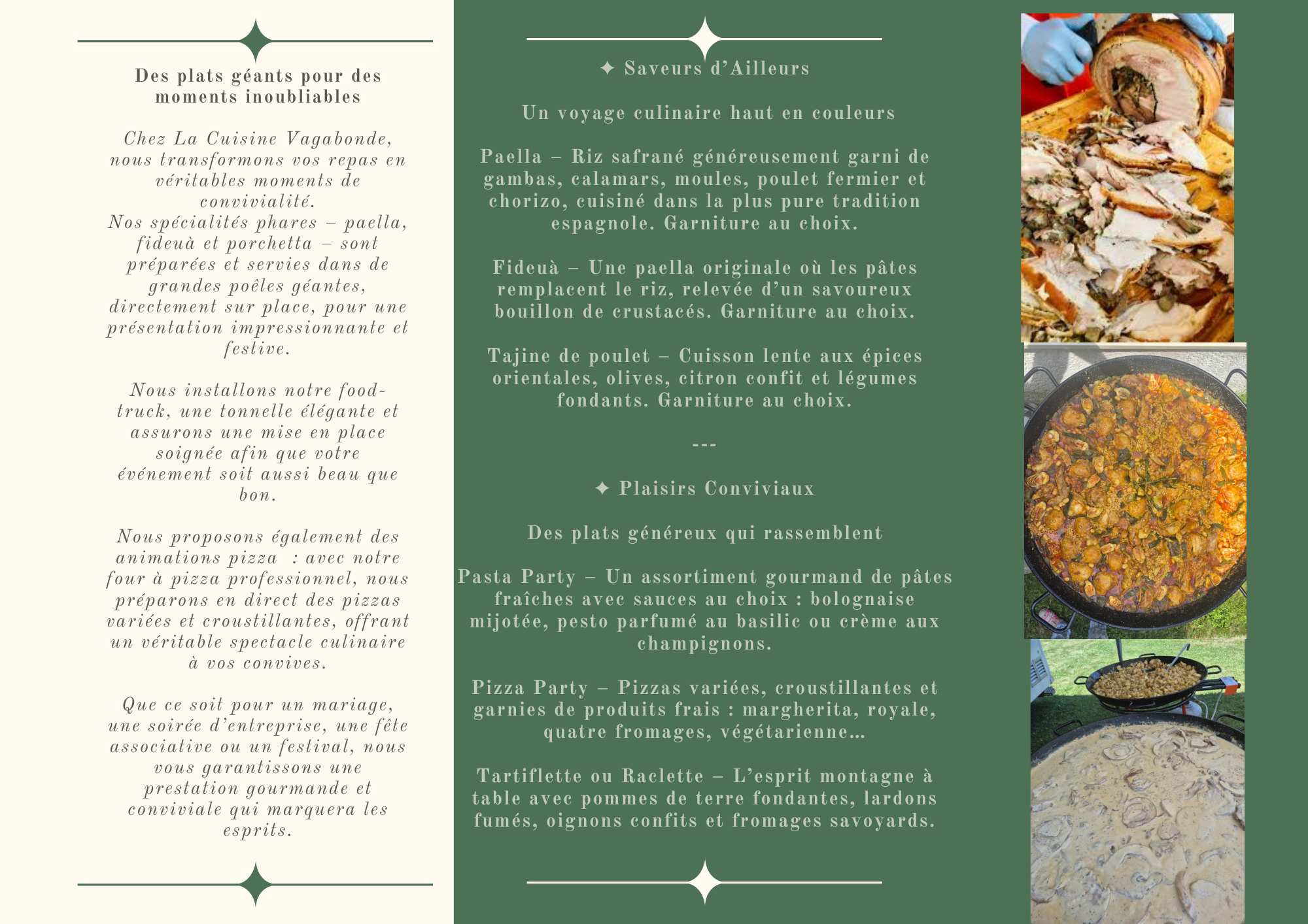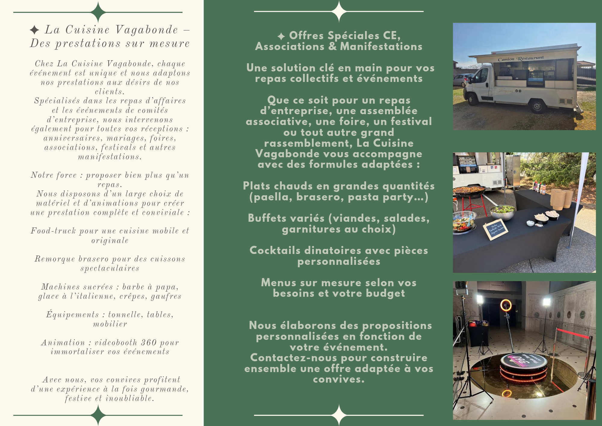 Grâce à notre food truck et notre remorque brasero, nous assurons un service mobile complet, pour toutes vos prestations : cocktails, repas traiteur, plats chauds, buffets sucrés ou salés.